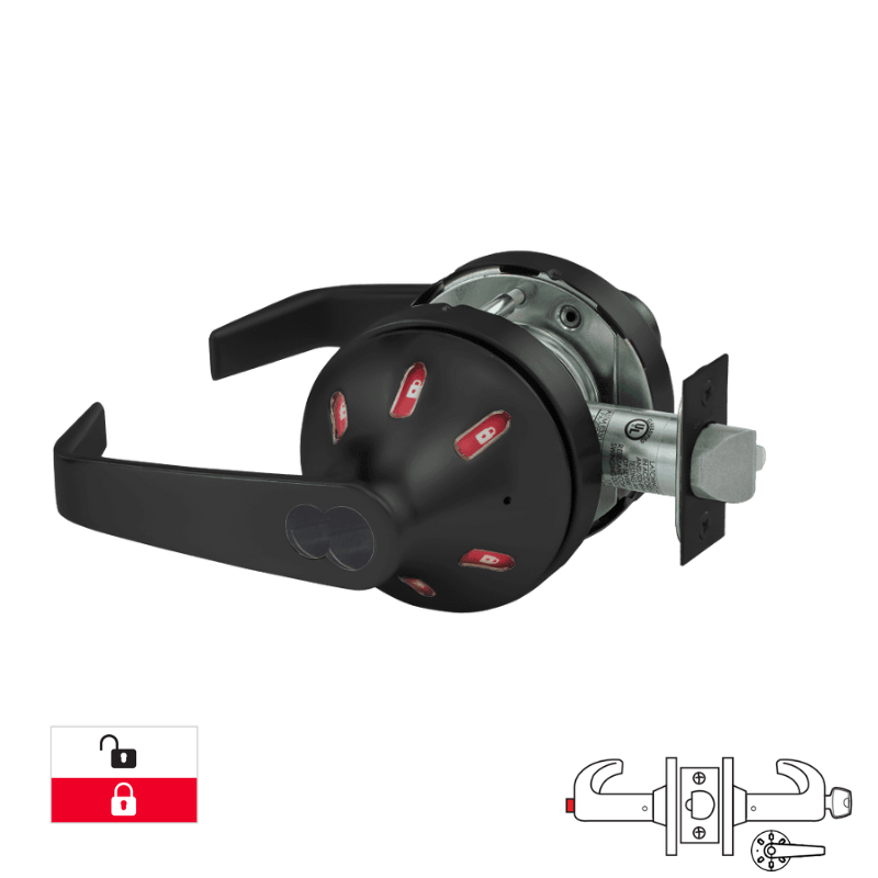 - Latch by either lever unless outside lever is locked by push button in inside lever