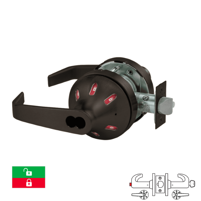 The Sargent 70-V33-10XG44-VSLL delivers professional-grade security for service station environments with its Grade 1 cylindrical lock construction. Equipped with synchronized visual indicators on both sides—green and red status displays—this lock provides immediate occupancy recognition. Built to SFIC standards with "L" lever mechanics and "VSL" rose configuration, it accommodates 2 3/4" backset and 4 7/8" strike specifications. Core purchased separately. Purpose-built for demanding commercial access control applications.