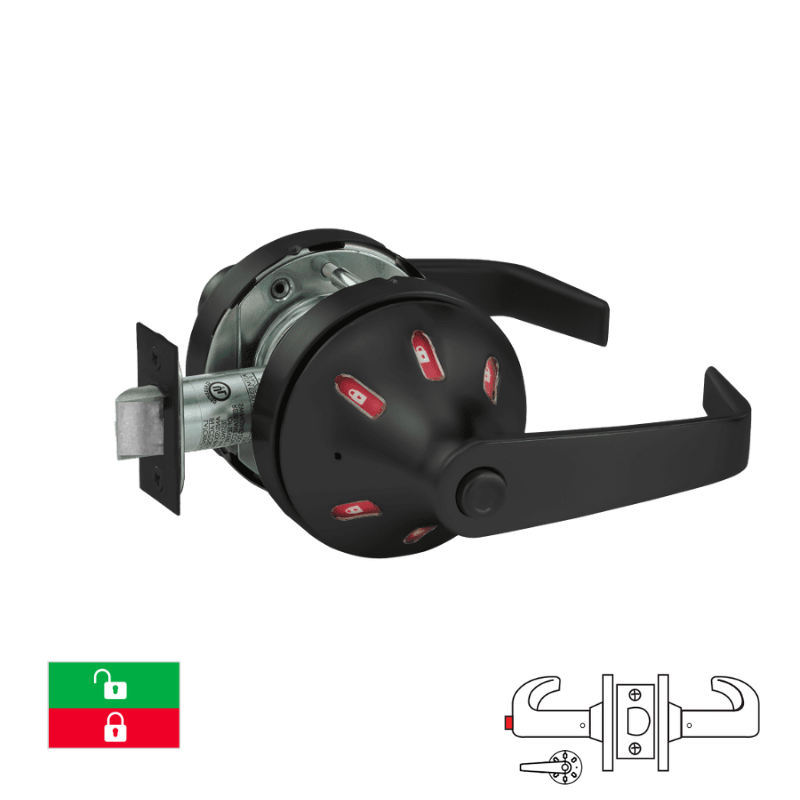 - Latch by either lever unless outside lever is locked by push button in inside lever