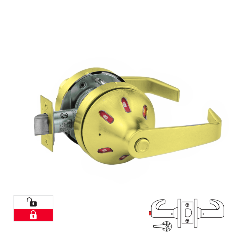 - Latch by either lever unless outside lever is locked by push button in inside lever